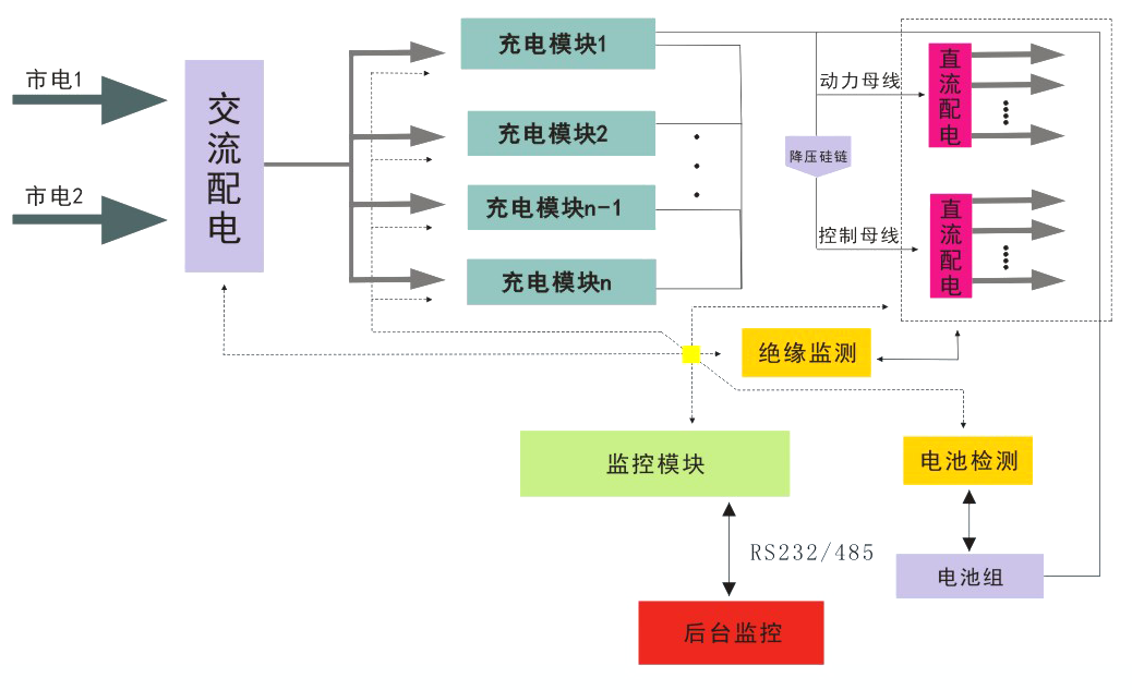 隨著我國電力事業(yè)的迅速發(fā)展和大規(guī)模技術改造的投入,對直流開關電源設備和系統(tǒng)的要求越來越高,過去的相控電源和磁飽和式電源存在穩(wěn)壓、穩(wěn)流精度差、紋波系數(shù)大及對電網輸入諧波污染嚴重等缺點,已不能滿足我國電力工程和各行業(yè)發(fā)展的需求。我公司生產的AHE-GZDW系列高頻開關直流電源系統(tǒng)具有穩(wěn)壓穩(wěn)流精度高,響應速度快,噪聲小,效率高等特點,且可以很方便的實現(xiàn)“四遙”功能和N+1冗余備份,使得系統(tǒng)運行更加穩(wěn)定?,F(xiàn)已廣泛應用于各類發(fā)電廠和變電站,國家重點工程如地鐵、油田、化工;冶金、鐵路等領域都有良好的應用業(yè)績。它還為控制負荷和動力負荷以及直流事故照明負荷等提供電源,是當代電力系統(tǒng)控制、保護的基礎。